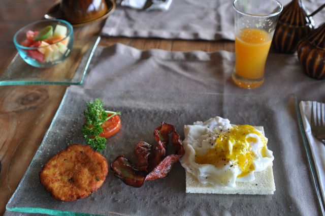 DSC_2607 Published December 30, 2013 at 640 × 425 in BALI Breakfast came with the room…today I had potatoes, bacon, poached eggs, and a fruit bowl….with freshly squeezed tangerine juice and a few cups of rich Indonesian coffee.