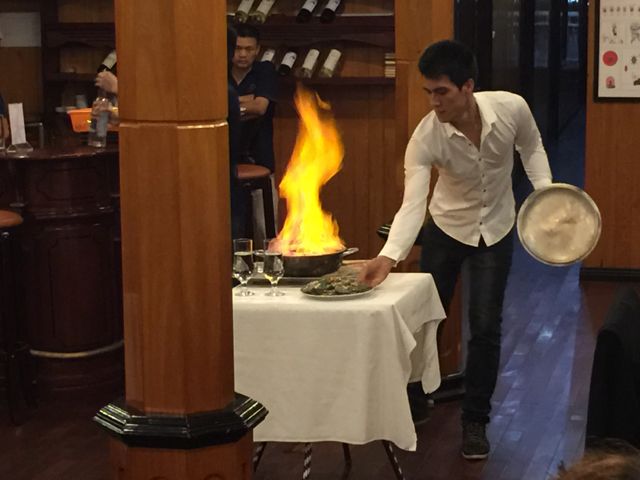 IMG_1909 Published April 4, 2015 at 640 × 480 in Vietnam – Halong Bay One of our meals….1. place hot rock in wok, fill with fresh shrimp, pour in vodka, light, then add water for steam.