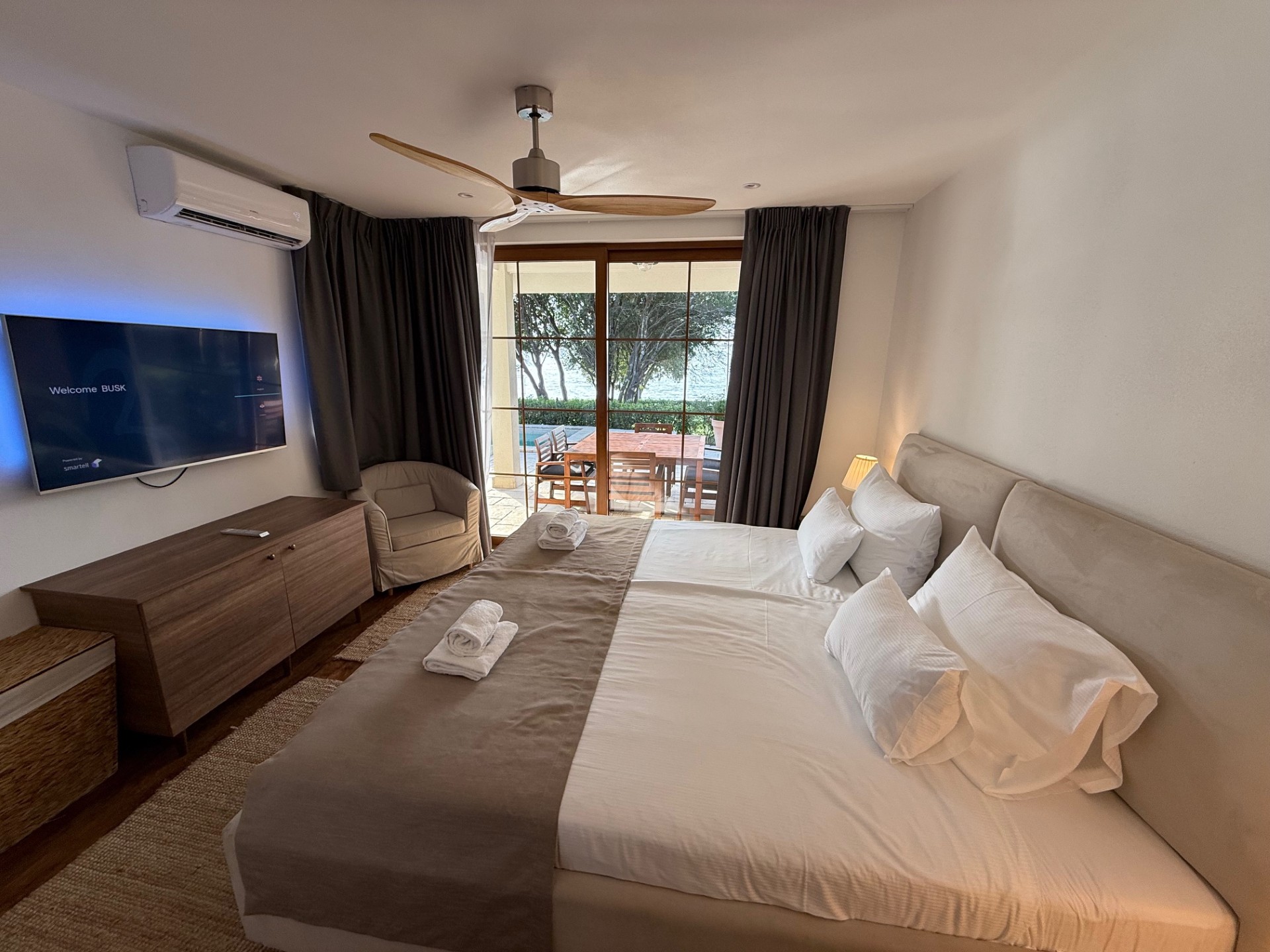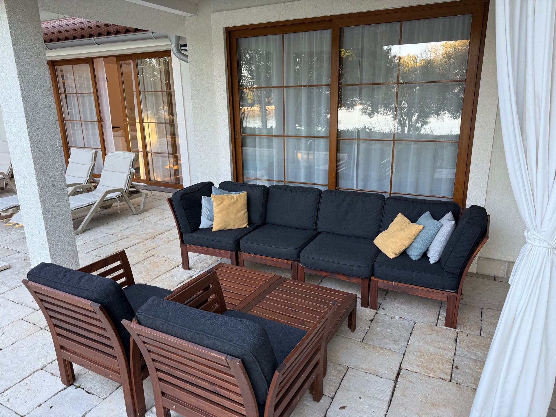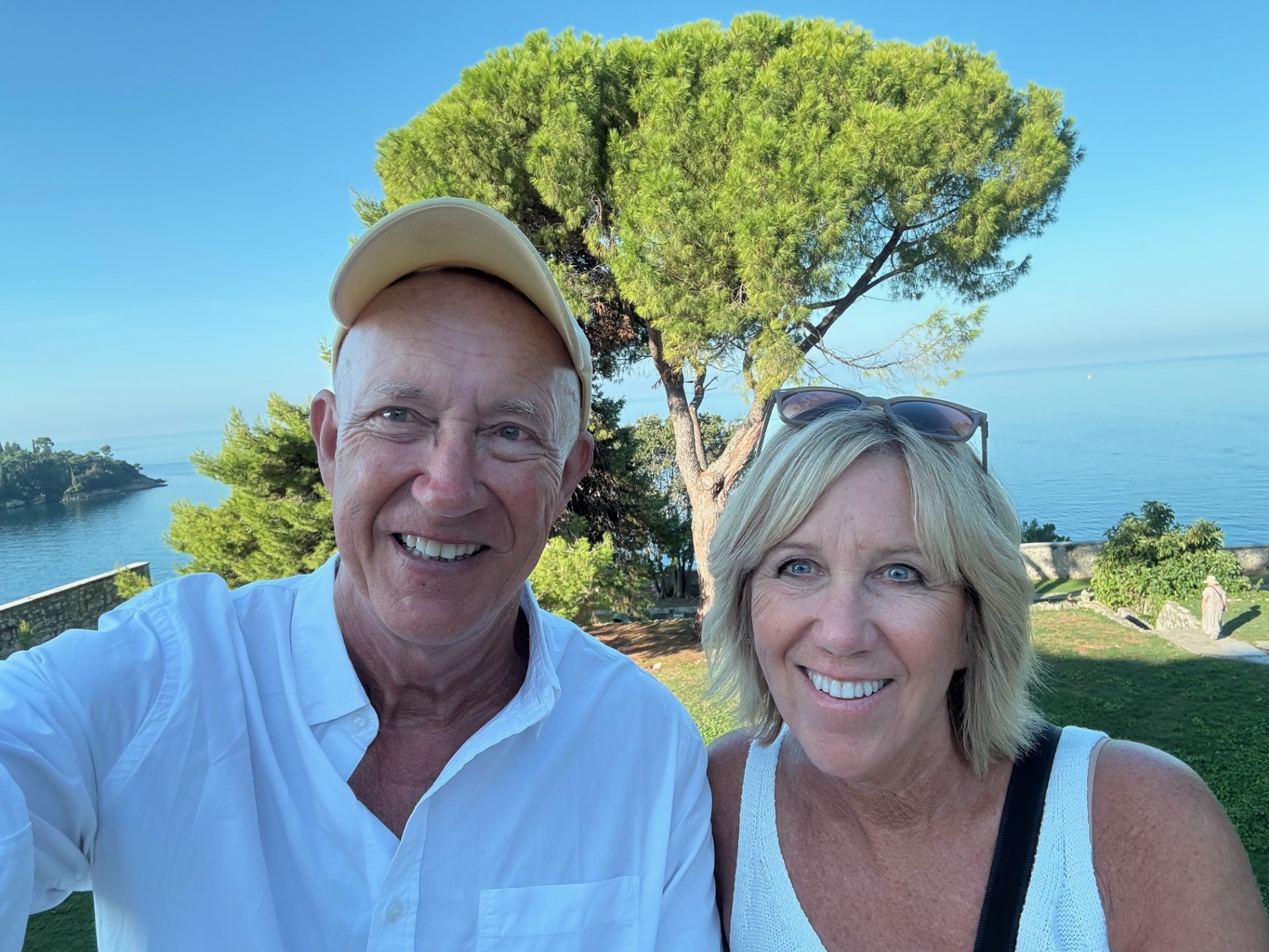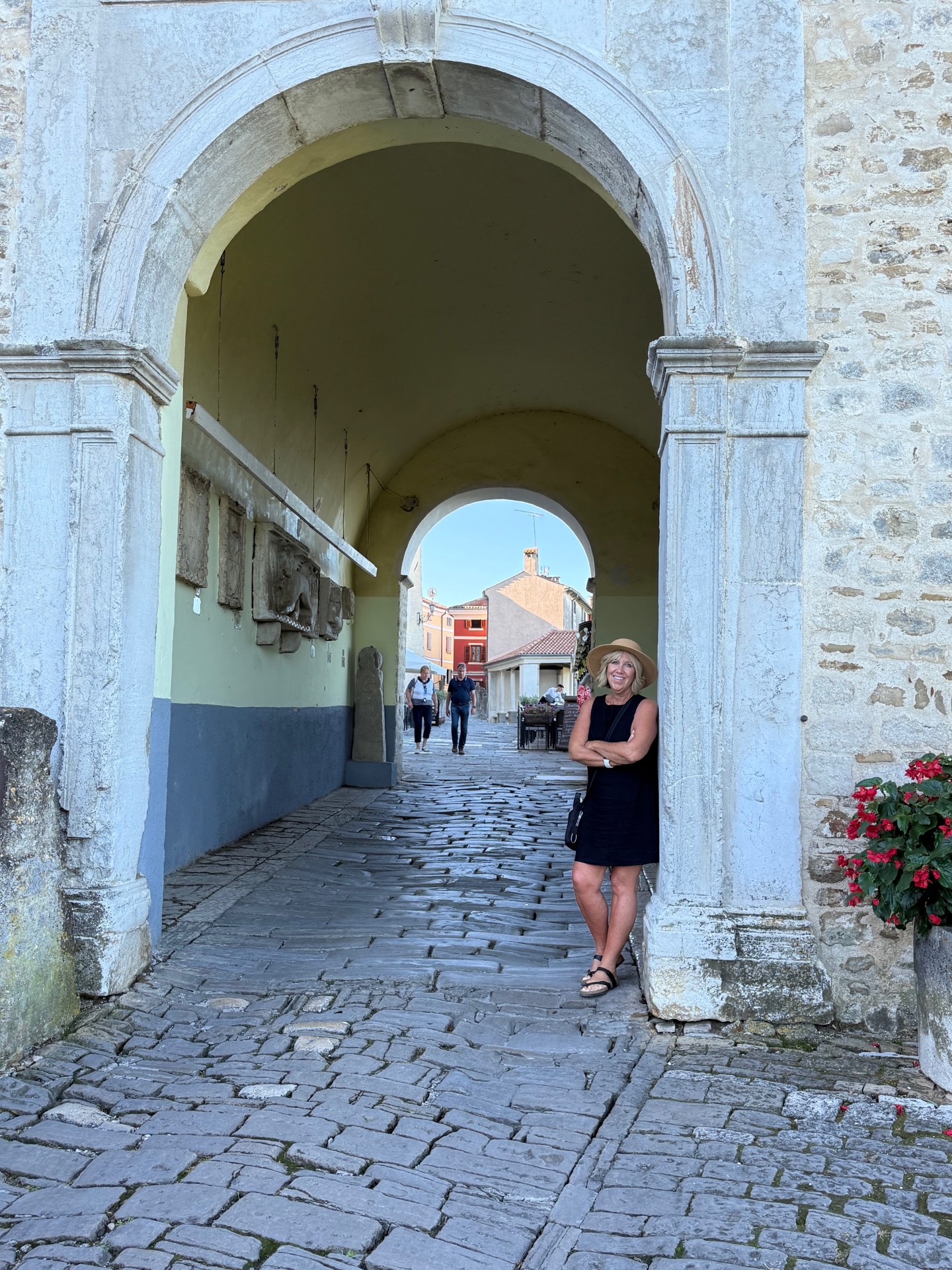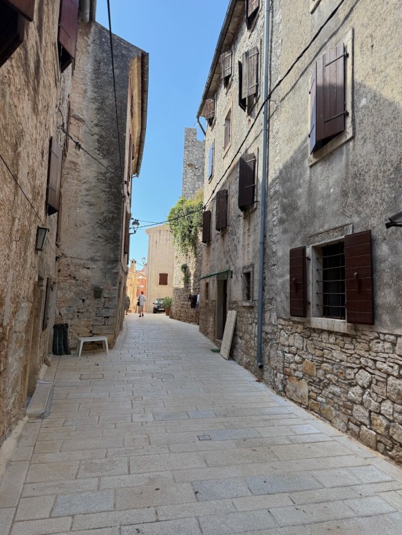 Croatia, a new country for us. We wanted to rent a car in Venice and drive to Croatia, but the fees charged to enter a different country and to drop off at a different location were astronomical. So we hired a ride from Venice to Pula. We picked up our car at the airport and hit the road to first explore the Istria Peninsula. Our home base for the next week would be Bale (Bah Lay). We found the most amazing villa, right on the beach with our own pool. It would have been perfect for two couples as on either side of the living room/kitchen was a large bedroom and bathroom. It was so comfortable we often thought we might just lounge around the pool the entire week. The villa was located in the Mon Perin Recreation Site…..a huge resort with sections set aside for campers and tenters, another section with small trailer like accommodations, and then our luxury villa location. On site was a spa, several restaurants, a water park, bakery, grocery store, beach craft rentals, and so much more, but it was so spread out you rarely saw other people, and there were miles of walking paths. We even had our own golf cart to motor about in. We really felt spoiled.